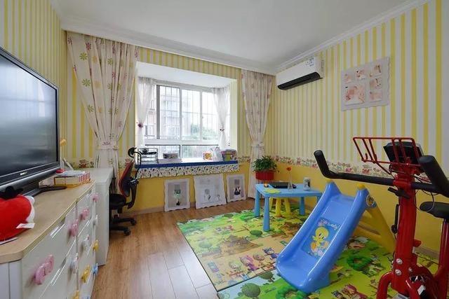 ▲由于儿童床被搬到了主卧,儿童房变得格外的宽敞,放上一个小滑梯,一张小书桌,一个儿童动感单车,儿童房暂时被布置成了小孩的玩乐休闲空间。