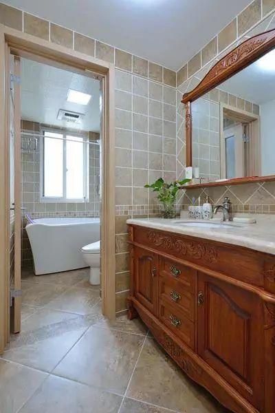 ▲卫生间干区的墙面和地面都是复古的砖色,镜面后的墙砖用不同的铺法将梳扮空间划分出来,整个干区是显得典雅大方。