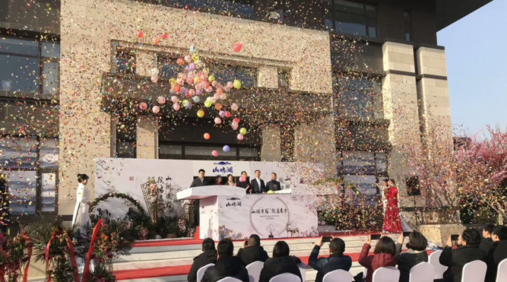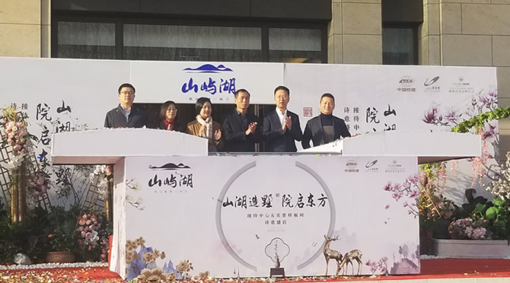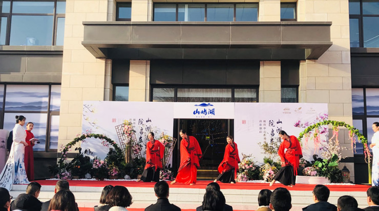 上午9点30分,一场别出心裁的魅力华夏舞拉开了活动的序幕,随后,中国铁建、碧桂园和国瑞置业的几位领导一起上台,将一幅寓意项目以“山水为伴,人文为本”的大型山水书卷,从启动台两侧缓缓拉开,七彩的气球雀跃飞出,宣告这座“深具东方美学的接待中心”正式待客。