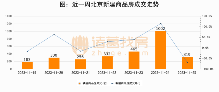 根据北京市住房和城乡建设委员会数据显示,2023年11月25日北京新建商品房成交319套,较昨日减少683套,环比下降68.2%