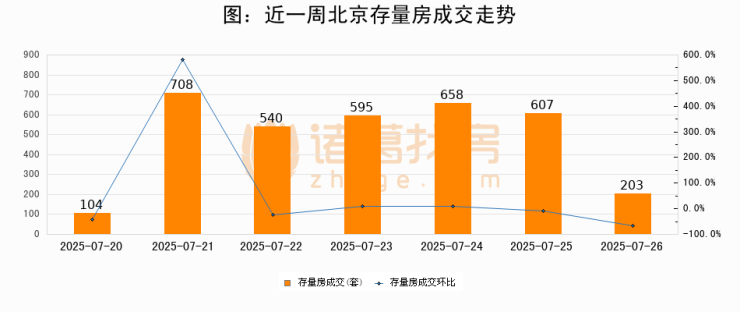 从存量房来看,2025年07月26日北京存量房单日成交203套,比昨日减少404套,环比下降66.6%。从近一周存量房成交来看,北京存量房日均成交套数为487套,07月26日单日成交203套,低于近一周平均水平58.3%。