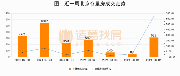 从存量房来看,2024年08月05日北京存量房单日成交629套,比昨日增加545套,环比上涨648.8%。从近一周存量房成交来看,北京存量房日均成交套数为514套,08月05日单日成交629套,高于近一周平均水平22.4%。