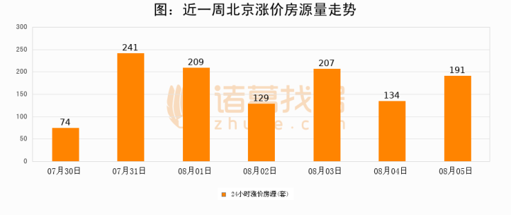 根据诸葛找房数据显示,北京24小时涨价房源量为191套,较08月04日增加57套,环比上涨42.5%。与此同时,涨价房源占比小幅扩大,业主信心有所提升。