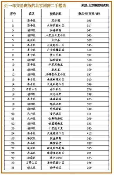 在北京套均价不超过450万且交易频率前31名的二手楼盘中,可以看出,目前,热门刚需二手房主要集中在昌平天通苑以及朝阳南部等区域。此外,海淀与西城也有可选择的刚需二手房源。