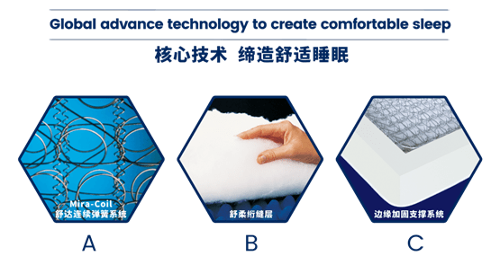 以舒达床垫为例,舒达坚持以市面上最流行的弹簧床垫为主,以Mira-coil舒达连续弹簧系统、舒达舒柔绗缝层、舒达边缘加固系统三大核心技术,确保床垫支撑性、舒适性、耐久性良好,帮助步入婚姻殿堂的新人享受到非一般舒适睡眠体验。