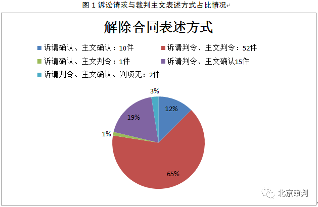 当事人在表述解除诉请时存在请求法院“确认合同解除”、“判令解除合同”、“解除合同”等不同表述方式。不同审判组织针对当事人同一解除诉请,存在不同的裁判主文表述方式。有的审判组织作出与当事人解除诉请一致的表述方式,以避免超诉请之嫌;有的审判组织针对当事人诉请中要求“确认合同解除”的表述方式,在裁判主文中用“判令”词眼进行表述;有的审判组织针对当事人解除合同之诉请,在裁判主文中不仅认定合同予以解除,同时亦在裁判主文中明确了合同解除的时间;有的审判组织在当事人未提及解除合同诉请时,自行在裁判主文中列明解除合同之判项;有的审判组织则认为若当事人在诉前已自行发出解除通知,则在主文表述中以“确认解除”方式予以表述。若当事人未于诉前发出解除通知,而是径行起诉要求解除合同,则以“判令”方式解除合同。笔者研究的80份样本具体情况为: