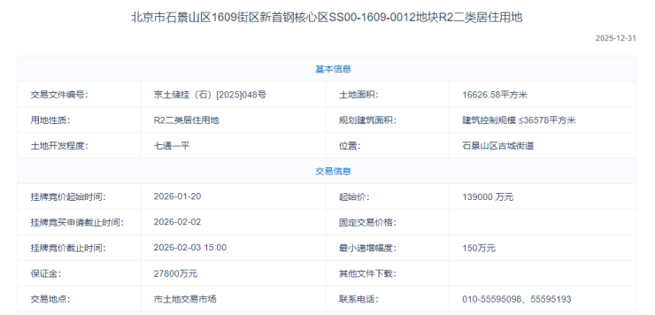 2、石景山区1609街区新首钢核心区SS00-1609-0012地块R2二类居住用地,该地块位于石景山区古城街道,起拍价13.9亿元,起拍楼面价约3.8万元/平方米。地块用地面积16626.58平方米,规划地上建筑面积约36578平方米,容积率约2.2,建筑高度≤45米,绿地率30%。