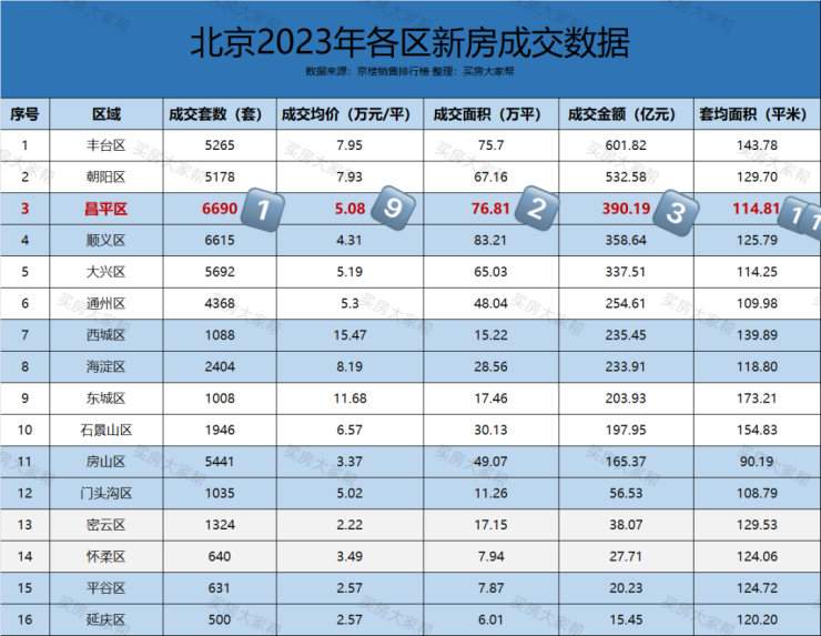 2023年,全北京十六个区大排名,昌平成交套数最多!但是成交均价却只排第九。