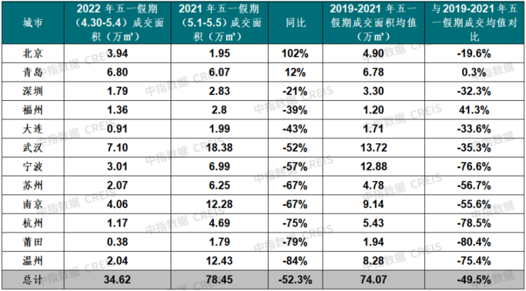 根据中指研究院发布的2022年五一假期期间部分重点城市新建商品住宅成交情况数据显示,重点监测城市中多数城市市场低温态势延续,成交规模同比降幅较大。重点监测城市新建商品住宅成交面积较去年五一假期下降52.3%。多数代表城市新房成交规模同比下降,其中武汉、苏州、温州同比下降均超五成。