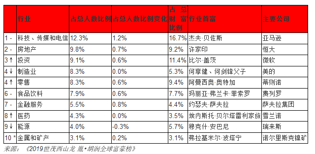 科技行业今年新增的十亿美金富豪数量较多,是全球十亿美金富豪的主要财富来源。加上房地产、投资、制造业和零售业,前五大行业的人数占据了榜单的一半。前十大行业的人数占整张榜单的70%以上。