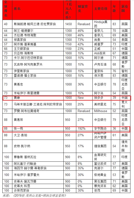 尽管430人跌出榜单,仍然有201位新人上榜。其中中国的新人数量较多,有52人。拼多多39岁的黄峥以1000亿元的财富领衔众新人,一举进入前100名。