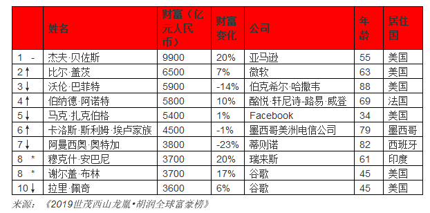 榜单显示,前十名中有6位来自美国,亚马逊CEO杰夫•贝佐斯以9900亿人民币蝉联世界首富。