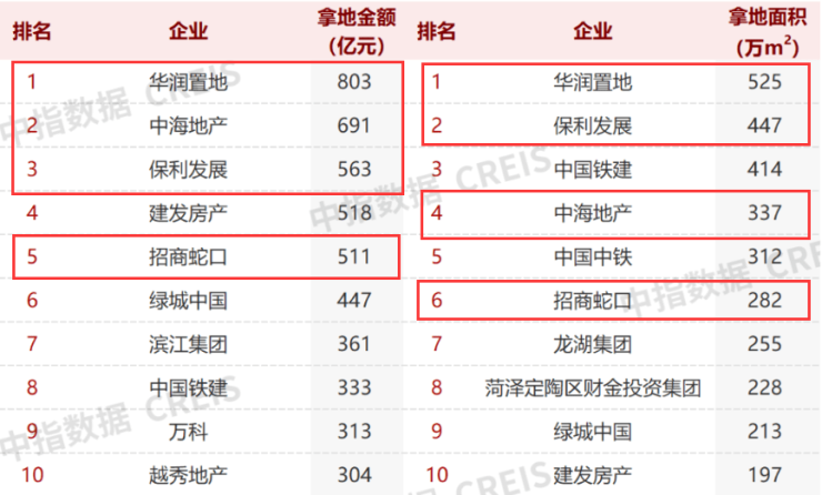 中指研究院发布的较新数据显示,在今年前10月的房企权益拿地金额榜上,华润置地、中海地产、保利发展和招商蛇口分别以803亿元、691亿元、563亿元和511亿元,排在排名前列、二、三、五位。在房企权益拿地面积榜上,这4家央企也均进入TOP6。