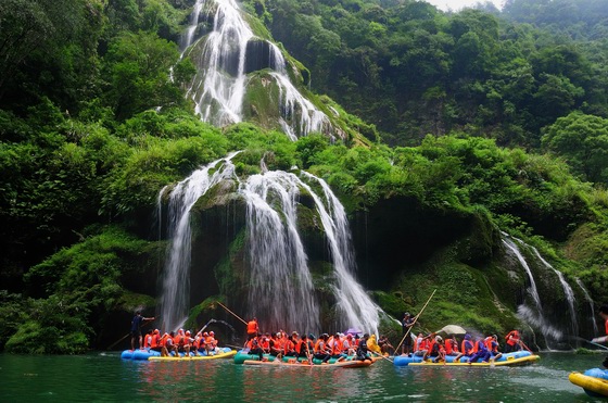 猛洞河漂流全程47公里。较精彩的上程漂,约17公里。两岸绿树葱笼,悬崖耸峙,飞瀑流泉与溶岩峰林交相辉映,构成一幅奇特的自然画卷,诚为寻幽探胜的黄金之河。著名社会学家费孝通先生誉之为“天下排名前列漂”。