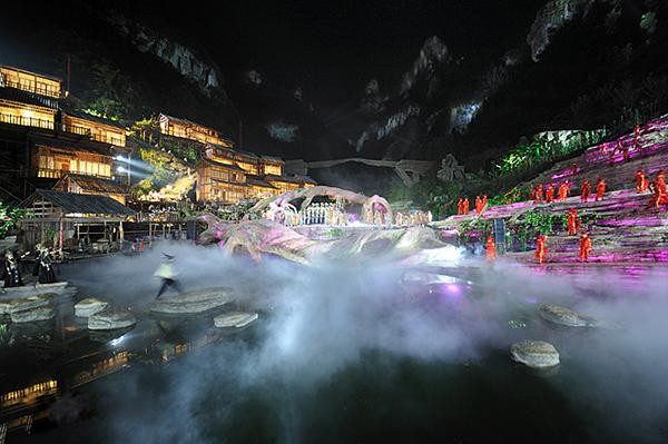 2、天门狐仙:天门狐仙全名《天门狐仙·新刘海砍樵》,是一部超震撼的山水实景演出、魔幻音乐剧。故事改编自神话传说《刘海砍樵》,讲述了一段感天动地的人狐之恋。剧中真实展现了东方玄幻风格的场景:近1万平米剧场的漫天飞雪、狐狸精在舞台上直接变幻成人型、超大可移动人造月亮、瞬间被流水包裹的5000平米玻璃钢炫彩舞台、60米长高空飞桥、主人公飞升至上百米高空变换成星星消失…剧中使用了大量机械、魔术及特效,营造出一幕幕令人惊异的奇幻场景,让观众瞠目结舌、匪夷所思。由于剧情感人,坐在观众席甚至能看到旁边观众在抽泣…达到视觉听觉心灵的三重享受
