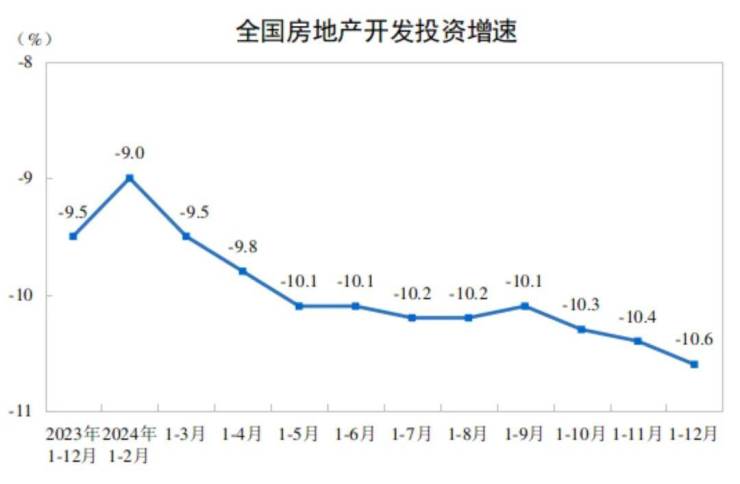 开发投资层面,2024年全国房地产开发投资100280亿元,比上年下降10.6%;其中,住宅投资76040亿元,下降10.5%。