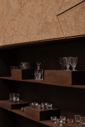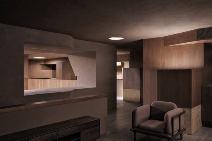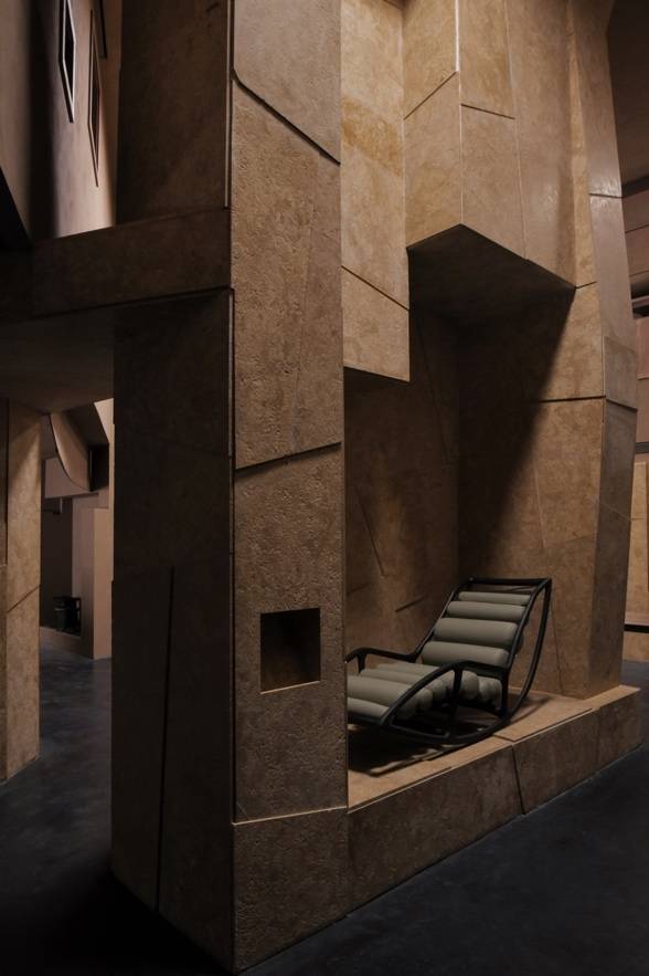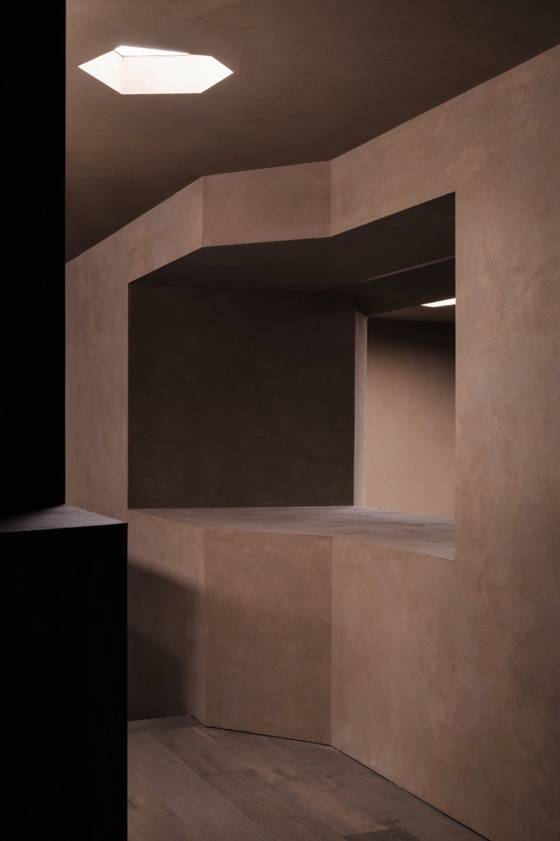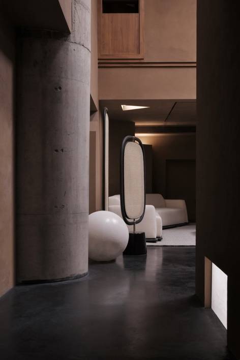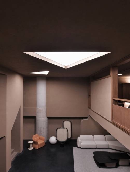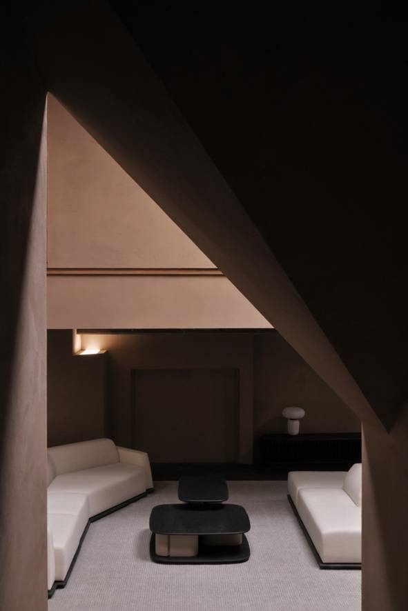 以汲取山粗矿的切面和结构的体量感,来放大人在空间里的氛围感知。穿梭于不规则的结构体量之间,人影掩映亦或是驻足于家具前,空间、氛围,都足以构成一道道戏剧场景,达到一种静态的审美,简单深沉而有力量。
