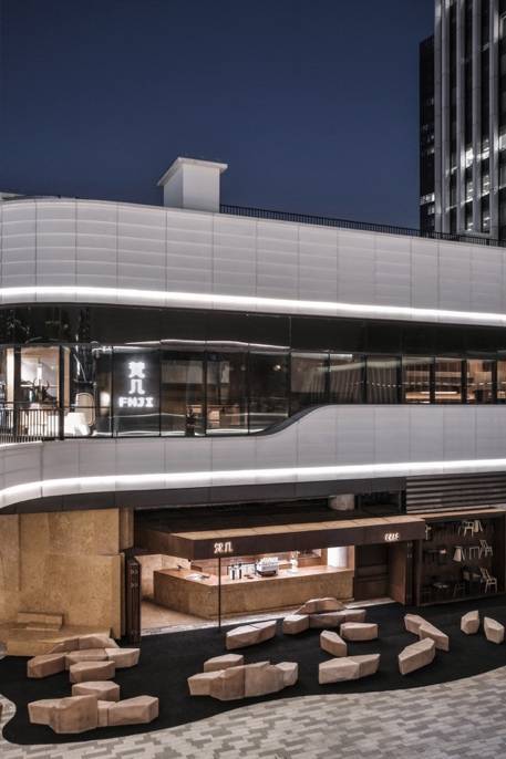 此次梵几旗舰店选址于上海前滩太古里,并再次邀请了东形西见团队一同对店铺进行设计搭建,将取诸山野的灵气带回繁华的城市之中,以山石之形筑造成一个温暖的庇护所。门店共分为两层:四层及其夹层为家具展示空间,三层及户外区域为crag咖啡空间,总面积达827平方米。