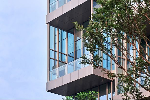 麒麟荟位于麓湖中央湖心岛,三面环水,占据麓湖较核心的景观资源,整座建筑以水晶盒子为灵感,悬空错落堆叠组合,伸向湖面与天空,令每一户都拥有接近360° 的景观视野。它通过一系列的空中花园,天桥和水路建立了一个多尺度的系统,让住户沉浸在项目中的湖泊和绿地等生态系统当中。