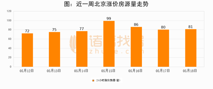 根据诸葛找房数据显示,北京24小时涨价房源量为81套,较05月17日增加1套,环比上涨1.2%。与此同时,涨价房源占比小幅扩大,业主信心有所提升。