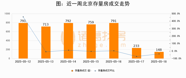 从存量房来看,2025年05月18日北京存量房单日成交148套,比昨日减少85套,环比下降36.5%。从近一周存量房成交来看,北京存量房日均成交套数为603套,05月18日单日成交148套,低于近一周平均水平75.5%。