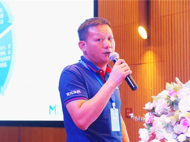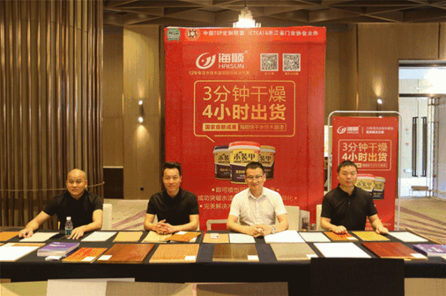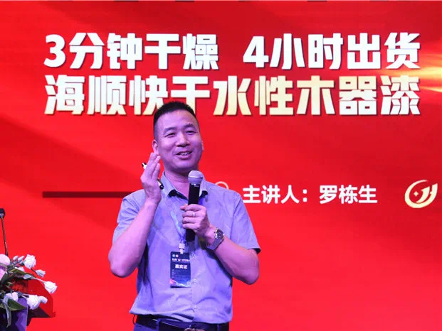 主题分享中,广东海顺新材料科技有限公司营销总监罗栋生主要针对“油改水痛点”,给出了水性漆解决方案。海顺新材料的方案特点为:排名前列,全水性,真环保。水漆涂装从底到面全水性,无苯零甲醛,优质解决 VOCs控排问题。第二,抗胀筋,封单宁酸。高封闭、抗胀筋、防黄变抑制单宁酸等技术国内先进,手感、丰满度、耐水性等物理指标媲美油漆。第三, 3分钟快干。海顺快干水性木器漆,3分钟干燥,4小时出货,出货速度提高10倍以上。第四,施工不分南北和季节。无论北方的冬天,还是南方的梅雨天,海顺快干漆一键自动快速干燥,行业排名前列解决了南北水土不服和季节施工的差异化。