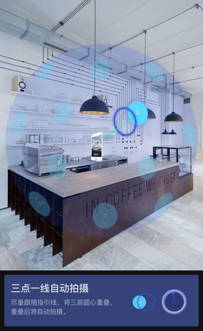 进入如视VR APP的操作界面,用户可根据自身需求,在操作界面自行选择一个合适的定位进行拍摄。根据这一定位,如视以AR辅助,引导用户通过三点一线的“瞄准层”进行24个点位的固定画面采集。用户仅需保持相机位置不变,调整角度,即可快速完成画面采集,整个过程不超过2分钟。