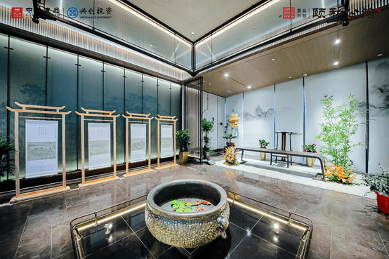 本次开放的颐和公馆营销中心在整体布局上采取中轴对称的设计手法,以当代艺术笔触传古承今,凝练传统文脉精髓,借鉴传统礼序,运用歇山顶、水纹、宫灯、屏风、竹等元素和泗水归堂、交绞造等构造,以形寓意,传达出对于美好生活的向往和追求,让人在移步易景间感受时间积淀而来的文化魅力与东方意蕴,于诗意间窥见生活之美。