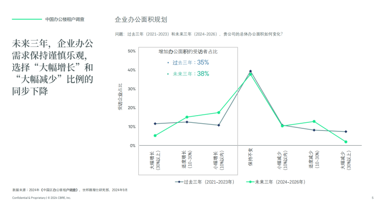 调查显示,在约250家受访企业中,仅有38%的受访租户计划在未来三年增加办公面积,略低于去年但高于过去三年平均水平。世邦魏理仕指出,大幅增减办公面积意愿的租户比例均显著下降,说明企业期望未来三年的业务发展逐步进入新稳态。