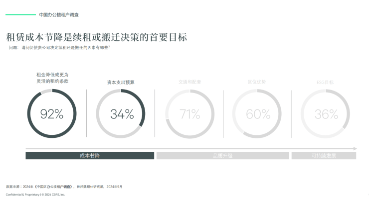 调查显示,降租或更为灵活的租约条款是企业决定续租或搬迁的首要考量,配套设施和服务紧随其后。另有六成租户将区位优势纳入选址决定性因素;1/3的租户关注楼宇是否符合可持续发展目标以及企业资本支出预算。
