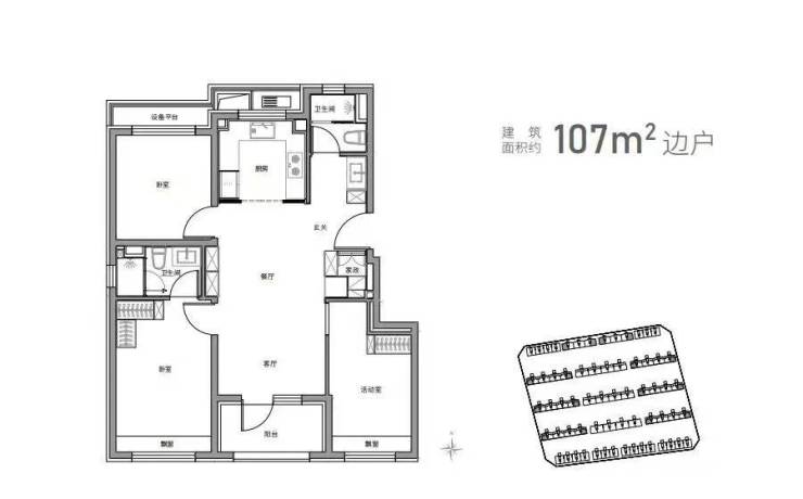 107平南北通透三居,三面宽朝南,客厅带阳台,南向两个卧室带飘窗,厨房、餐厅、客厅一体化,通透性好,主卧套房设计。整个户型比较方正,全明设计