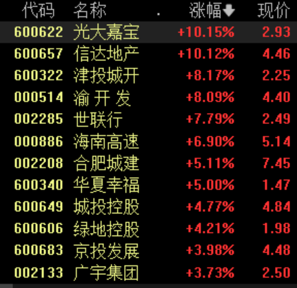 周一早盘,房地产板块开盘走强,截至发稿,光大嘉宝、信达地产涨停,津头城开、渝开发涨超8%。同时,港股房地产股盘初持续走强,截至发稿,旭辉控股集团涨近13%,富力地产涨超10%,中国金茂涨逾7%,万科企业涨超5%。