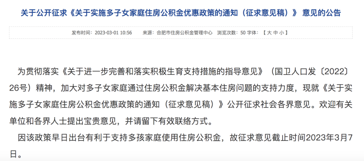 3月1日,为贯彻落实《关于进一步完善和落实积极生育支持措施的指导意见》,合肥市住房公积金管理中心发布关于公开征求《关于实施多子女家庭住房公积金优惠政策的通知(征求意见稿)》 意见的公告。