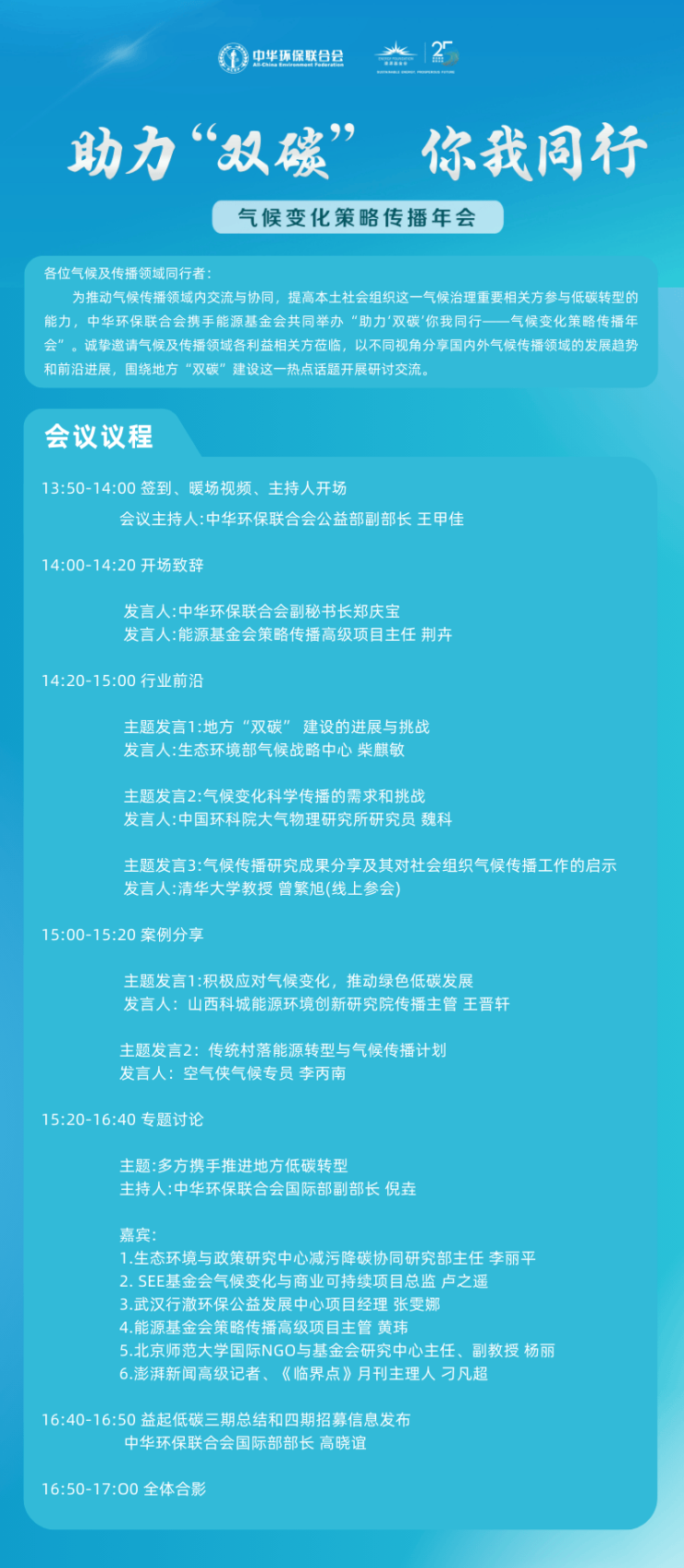 为更好的推动气候传播领域内的交流与协同,提高社会组织这一气候治理重要相关方参与低碳转型的能力,中华环保联合会携手能源基金会共同举办《助力“双碳”你我同行——气候变化策略传播年会”》。