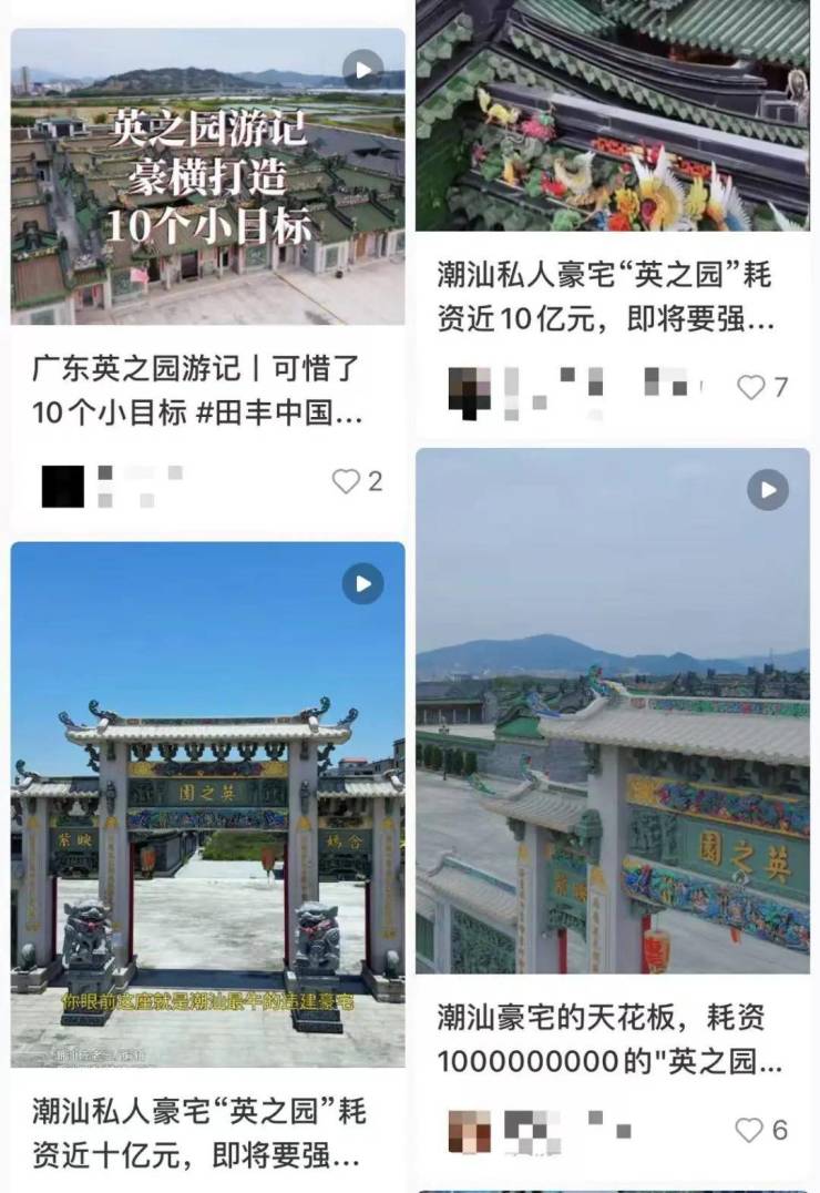 公开资料显示,英之园于2013年动工,该项目采用潮汕传统“驷马拖车”格局,融合北京四合院与欧式别墅风格。英之园主人陈某彪的身份始终笼罩着神秘色彩,具体职业、财富积累途径及社会关系网络等均未披露。