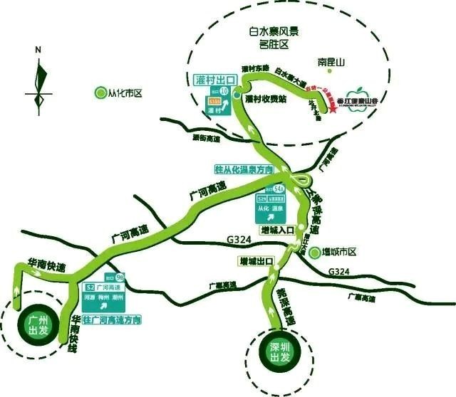 广州出发:全程60分钟,广州→ 华南快速干线→ 广河高速→ 增从高速(派潭出口)→ 香江健康山谷(白水寨方向)