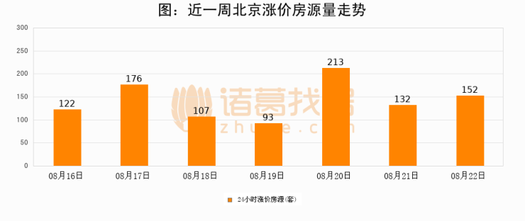 根据诸葛找房数据显示,北京24小时涨价房源量为152套,较08月21日增加20套,环比上涨15.2%。与此同时,涨价房源占比小幅扩大,业主信心有所提升。