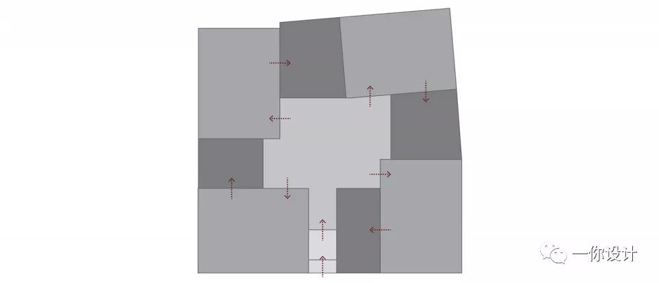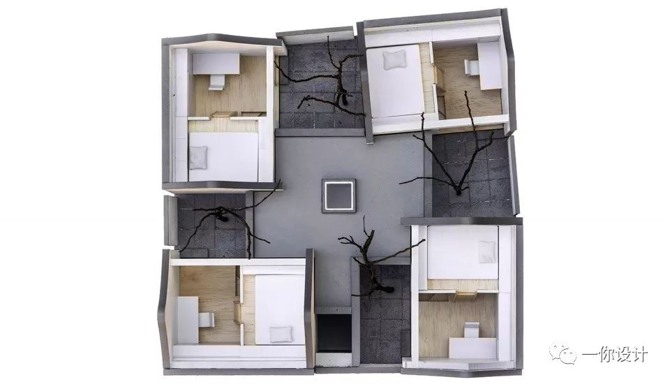 传统四合院里位于中间的院子是当之无愧的中心,所有的房间都朝向它。这种空间布局对应着传统的家庭生活,不再契合今天青年人的个人生活模式。个人生活的核心是私密性,所以我们的想法是将场地分为四组空间,每组包含一个房间和一个私人小院,它们各自朝向不同的方向,最终共同构成一个风车状布局。通过这种方式,每个房间和院子的私密性都得到保护。对比于传统四合院,本项目以四分院命名。从“合”到“分”的变化揭示出社会结构和生活模式在住宅中的转变。