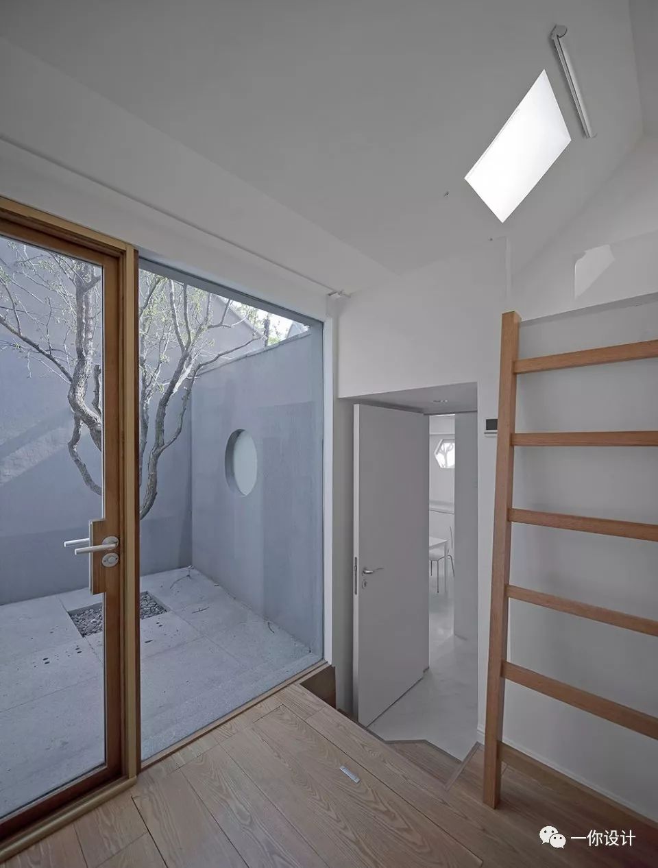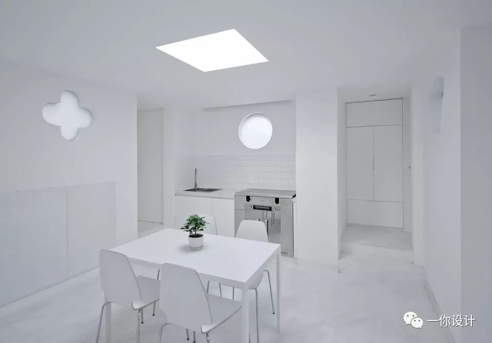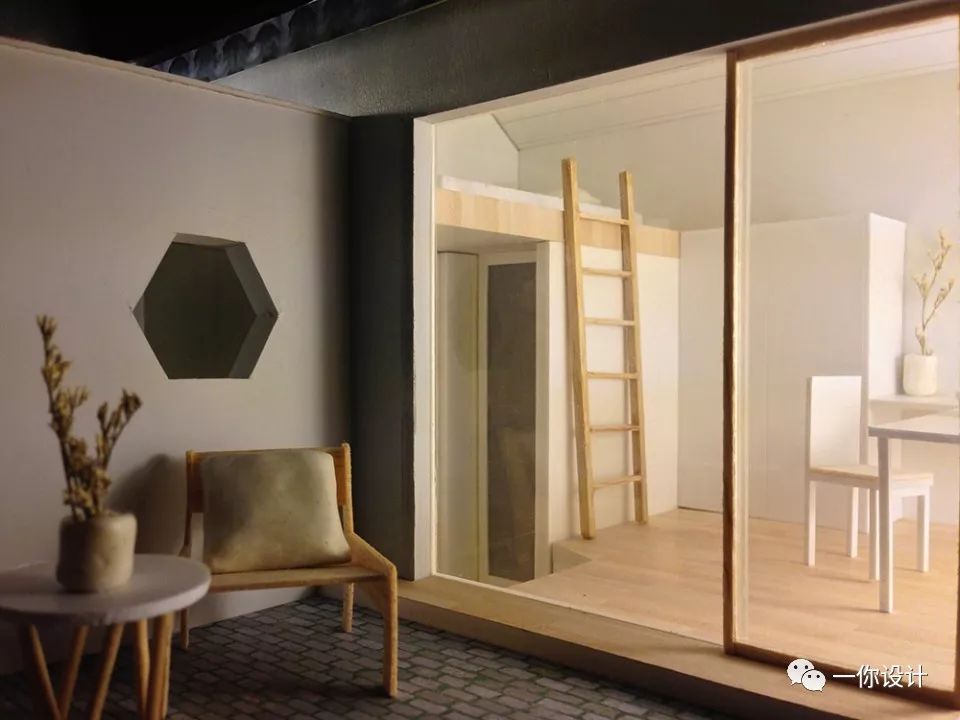In each room, the bed is lifted into attic space to free the ground space for living and bathroom. The skylight and full height glazing facing the yard bring in natural light and make contact to nature, offering a quiet and introverted atmosphere.