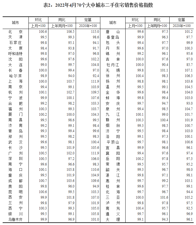 中国经济网北京5月18日讯(记者 李方) 国家统计局18日公布2022年4月份商品住宅销售价格变动情况统计数据显示,4月份70个大中城市中有47个城市新建商品住宅销售价格环比下降,有50个城市二手住宅销售价格环比下降。新房环比来看,成都、贵阳涨幅0.8%领跑,北上广深分别涨0.7%、持平、涨0.1%、跌0.1%。