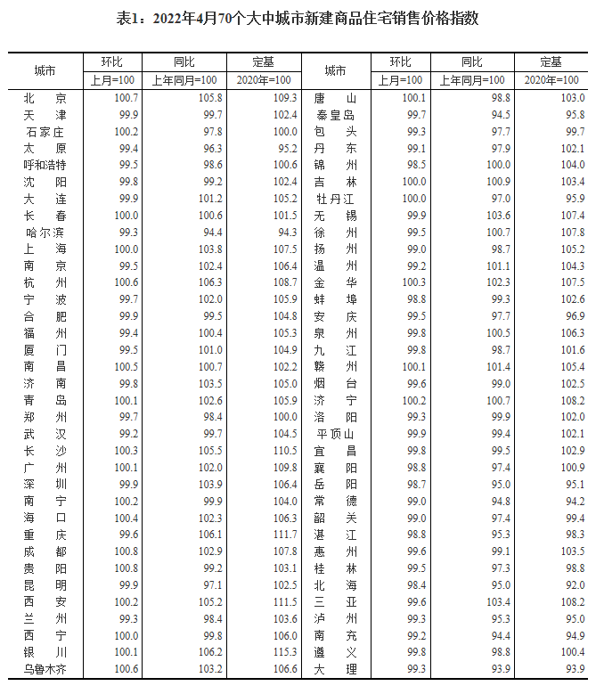 国家统计局城市司首席统计师绳国庆解读称,2022年4月份,70个大中城市中,商品住宅销售价格下降城市个数增加,一二三线城市商品住宅销售价格环比总体呈降势、同比继续走低。