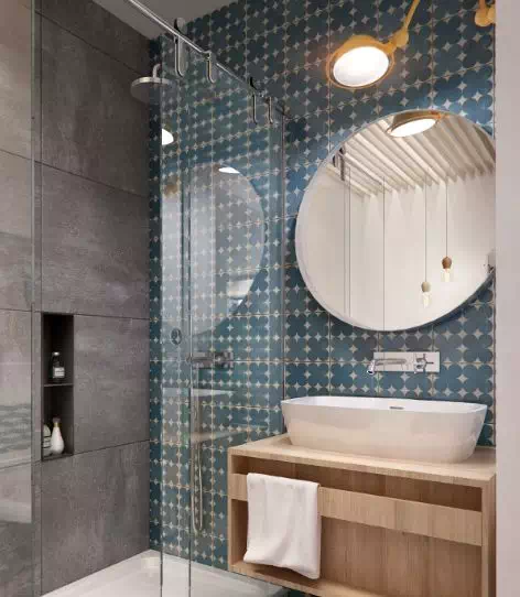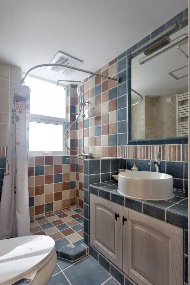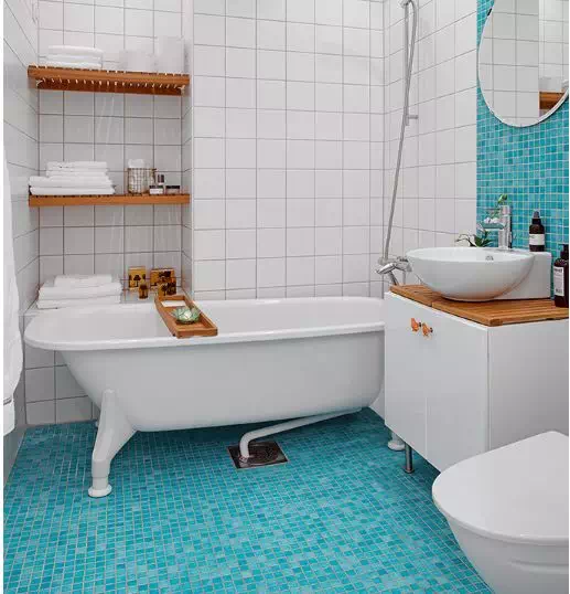 蓝色瓷砖给人清凉的感觉,和白色搭配,显得明亮、干净利落。