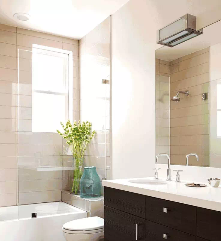 小卫生间肯定不会有一个很大的窗户来引光,所以一般都很暗淡,进去后很不舒服。如果不能通过开窗来增强室内采光,可以从灯光上解决,选择明亮的白光灯,使空间不显得紧凑。