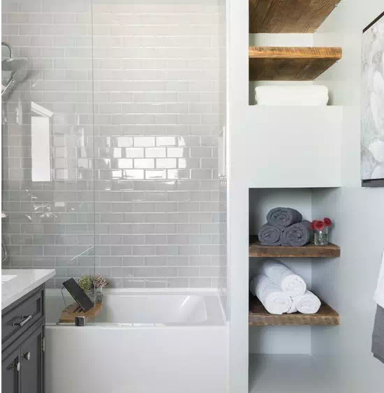 较推荐的是在墙上做一个壁龛,非常节省空间的一种收纳方法,小卫生间的福音。