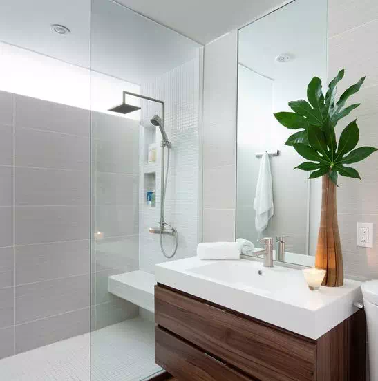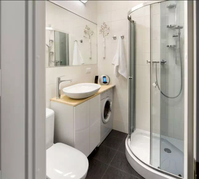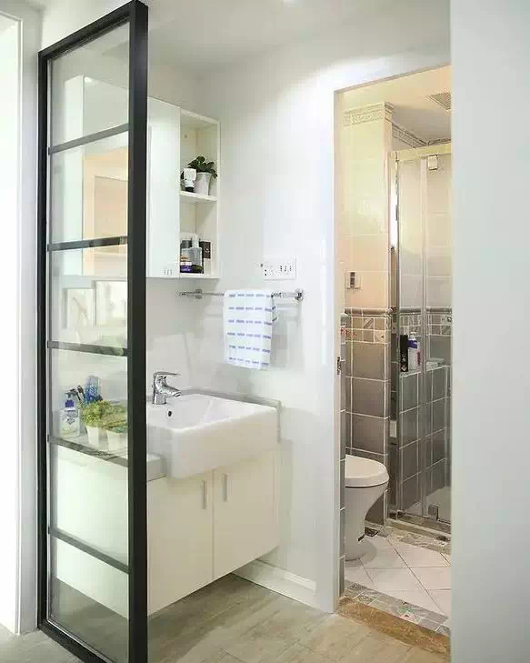 如果卫生间已经小的放不下洗漱台,那么将洗手台放至浴室外,让里面的空间不那么逼仄。