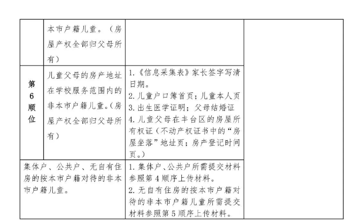 从上图可看出,一般顺位为房户一致>片区内房产>四老房产>仅户口>按京籍对待>非京籍,丰台区各小学录取顺序可能有所不同,具体以划片小学实际录取通知为准备!