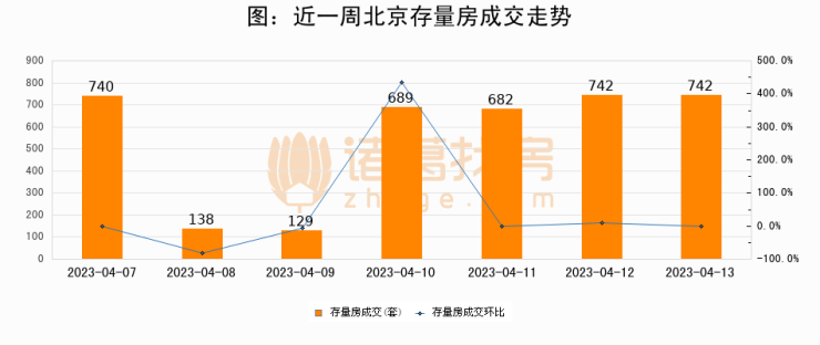 从存量房来看,2023年04月13日北京存量房单日成交742套,比昨日持平。。从近一周存量房成交来看,北京存量房日均成交套数为551套,04月13日单日成交742套,高于近一周平均水平34.7%。