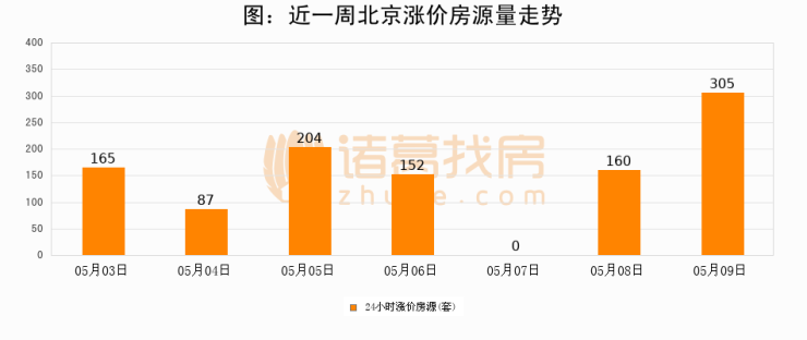 根据诸葛找房数据显示,北京24小时涨价房源量为305套,较05月08日增加145套,环比上涨90.6%。与此同时,涨价房源占比小幅扩大,业主信心有所提升。