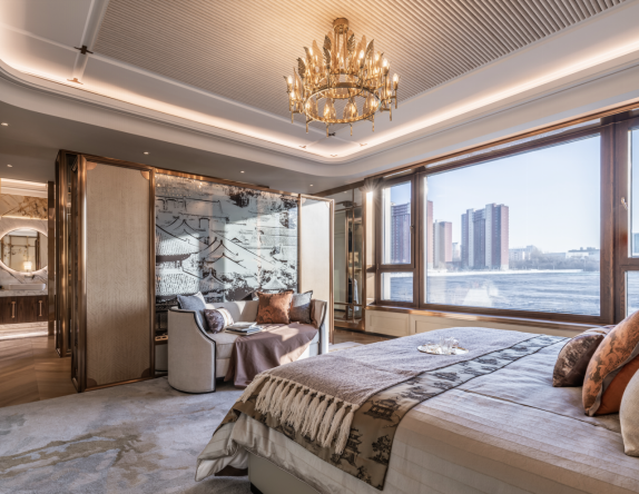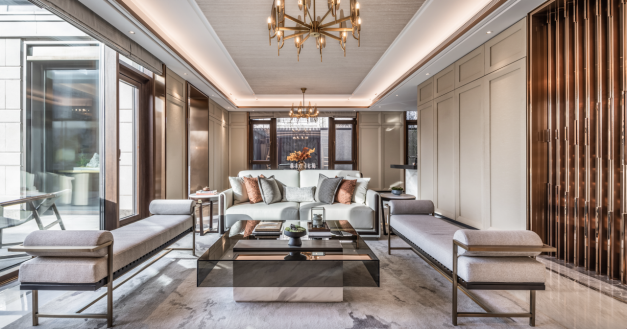 京: 京城,历代国都,天子脚下,深厚文化底蕴。秋:秋黄丰收季,事业丰收,人生完满的境界。中建·国望府以“京·秋”为设计理念,汲取京城的深厚文化底蕴,提取大量西山山系为背景及素材,以代表事业丰收、人生美满的银杏为元素,贯穿整个室内空间,呈现华美之意。