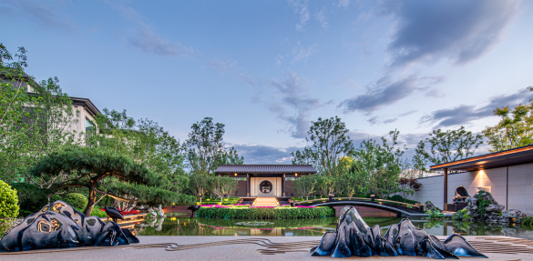 中建·国望府面向永定,背靠西山,前后照后有靠,力求体现以三为尊的哲学,遵循府门院门宅门的三进礼制,从步入园区开始,归家的仪式感便打造得酣畅淋漓。天地之间,景观轴线布局精巧,以92席堂堂正正的院落,有宫宇气概,有礼制有秩序,将中式文化精神融入其中,大气庄重,更讲究世代家庭的生活。沿袭千年坊巷院落文化,将合院形制融入当代新中式建筑语序,打造舒适又安逸的居住空间。提取抱鼓石、壁灯、匾额、格栅、挑檐、万字纹等传统中式符号,用现代建筑手法进行表现,以大宅府韵构筑和谐人居。